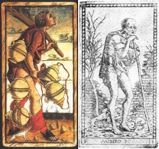 other relative, or else a wife, as fairy tales frequently begin. It is perhaps in a nod to Pythagoreanism that the cups he carries are 3 behind, 2 in front, the male and female numbers. His need is suggested by his similarity to the image of Poverty in the so-called "Tarot of Mantegna" (far right) with its dog, bare legs, and stick, although now closer to what will be the most familiar image of the tarot Fool.